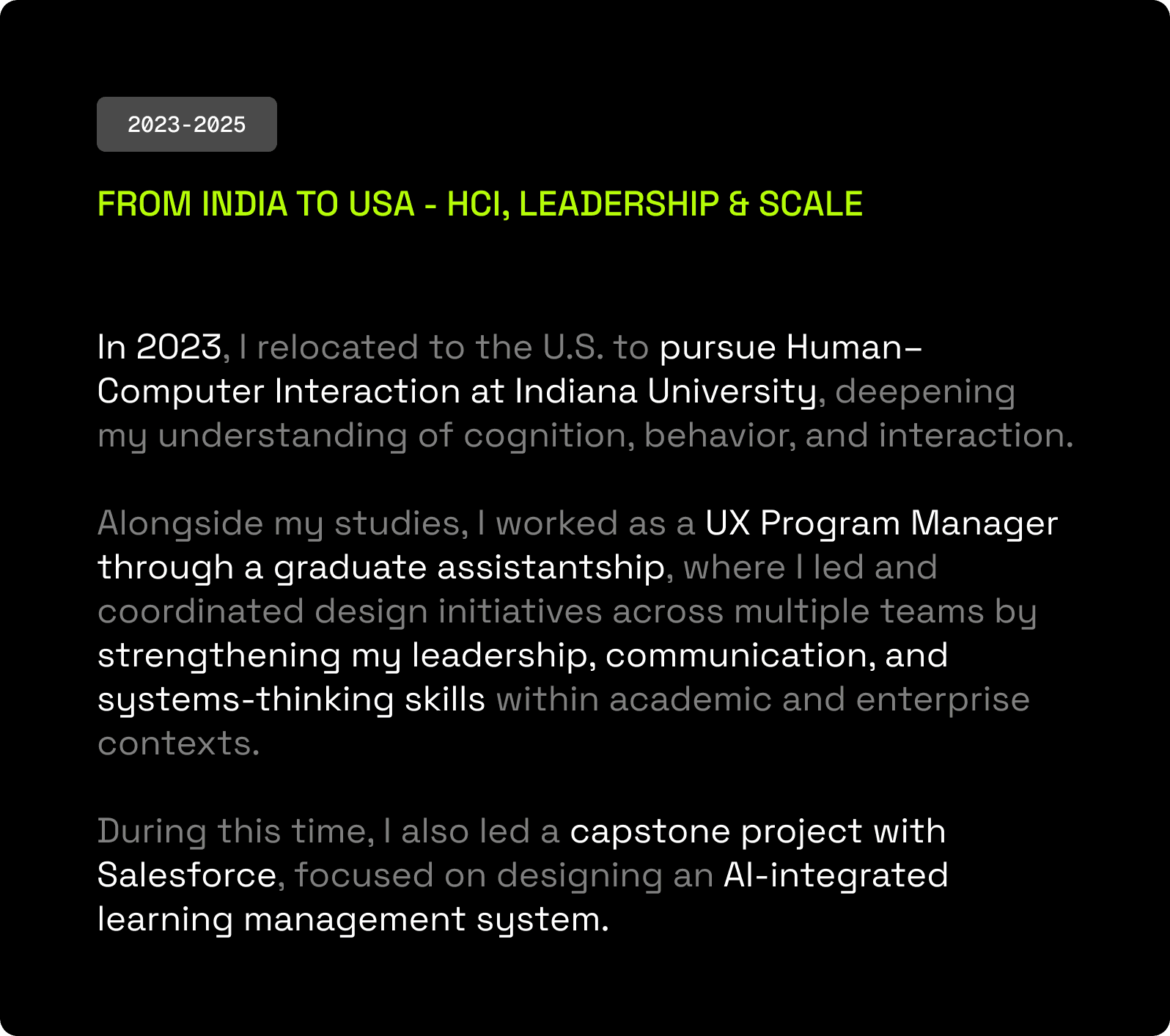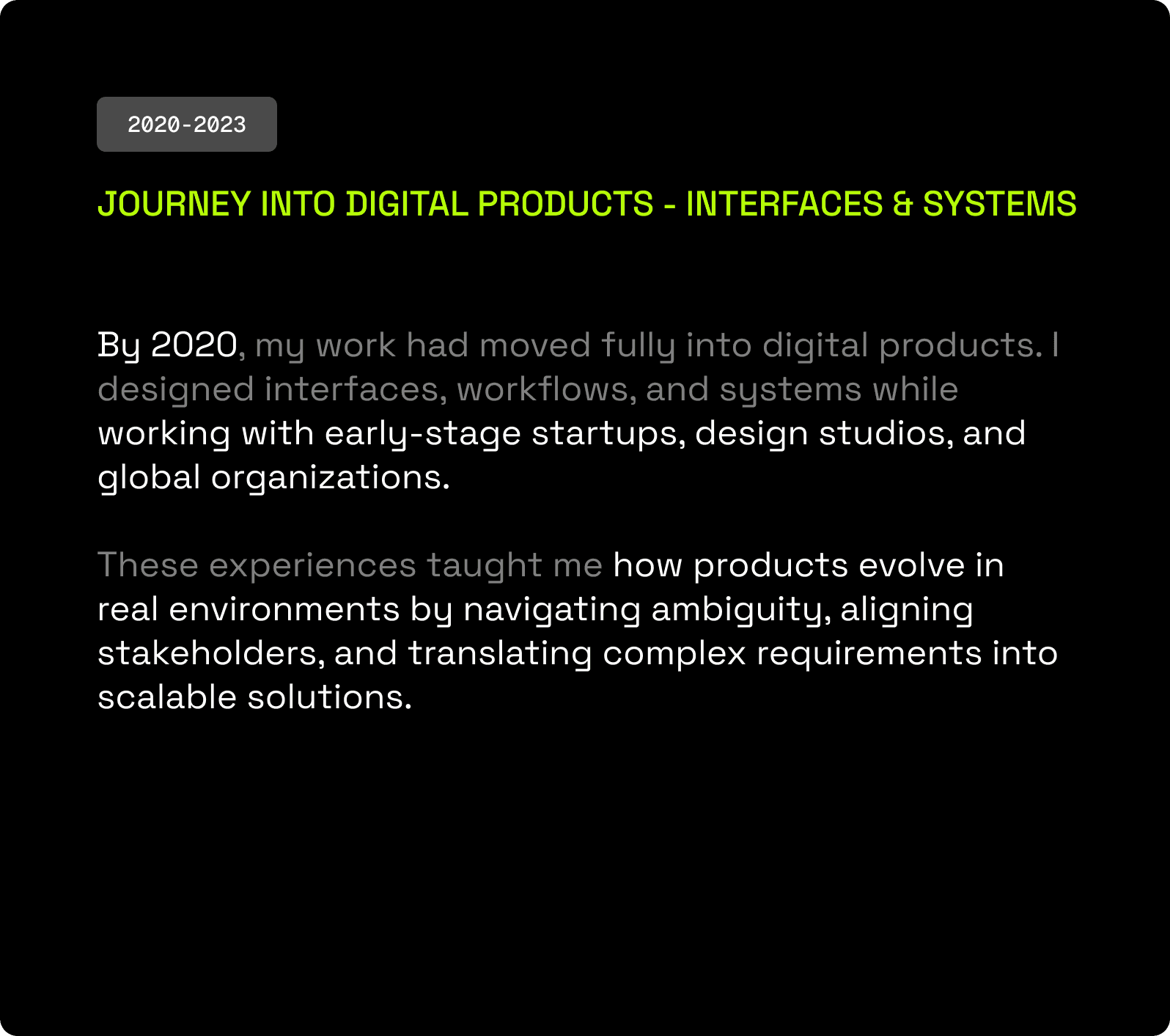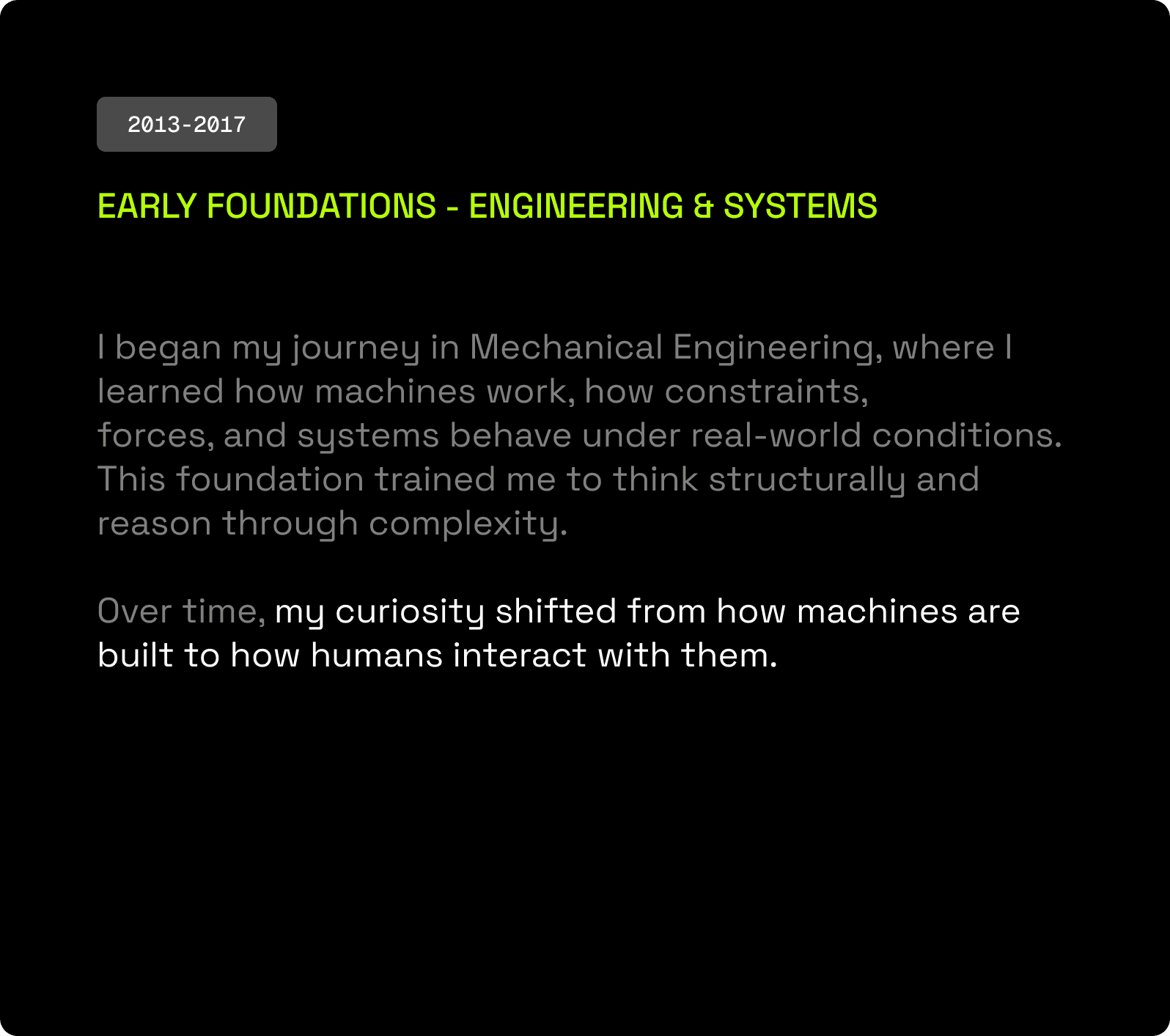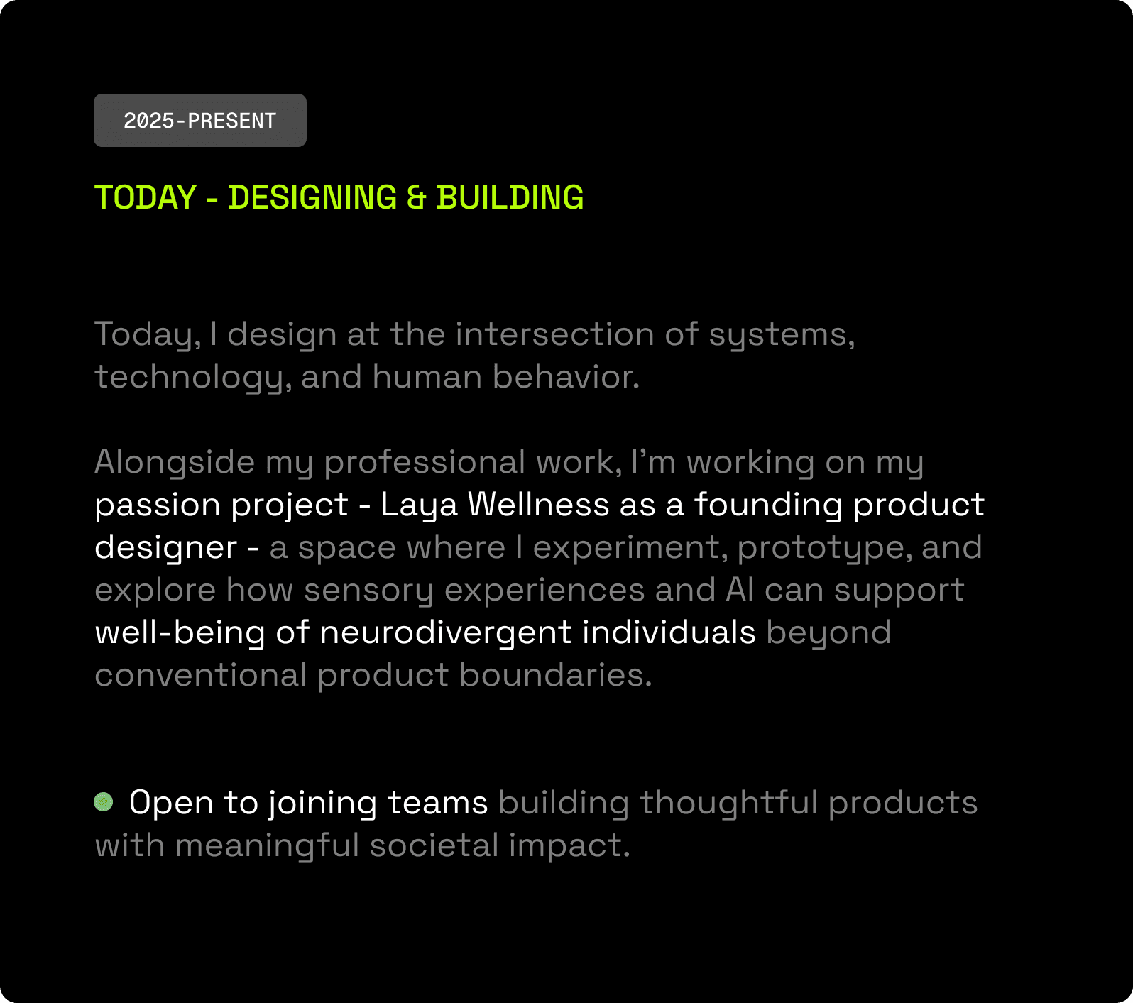 I’m drawn to complex, technical products where design, psychology, and technology intersect especially when thoughtful craft can reduce cognitive load and create real-world impact.