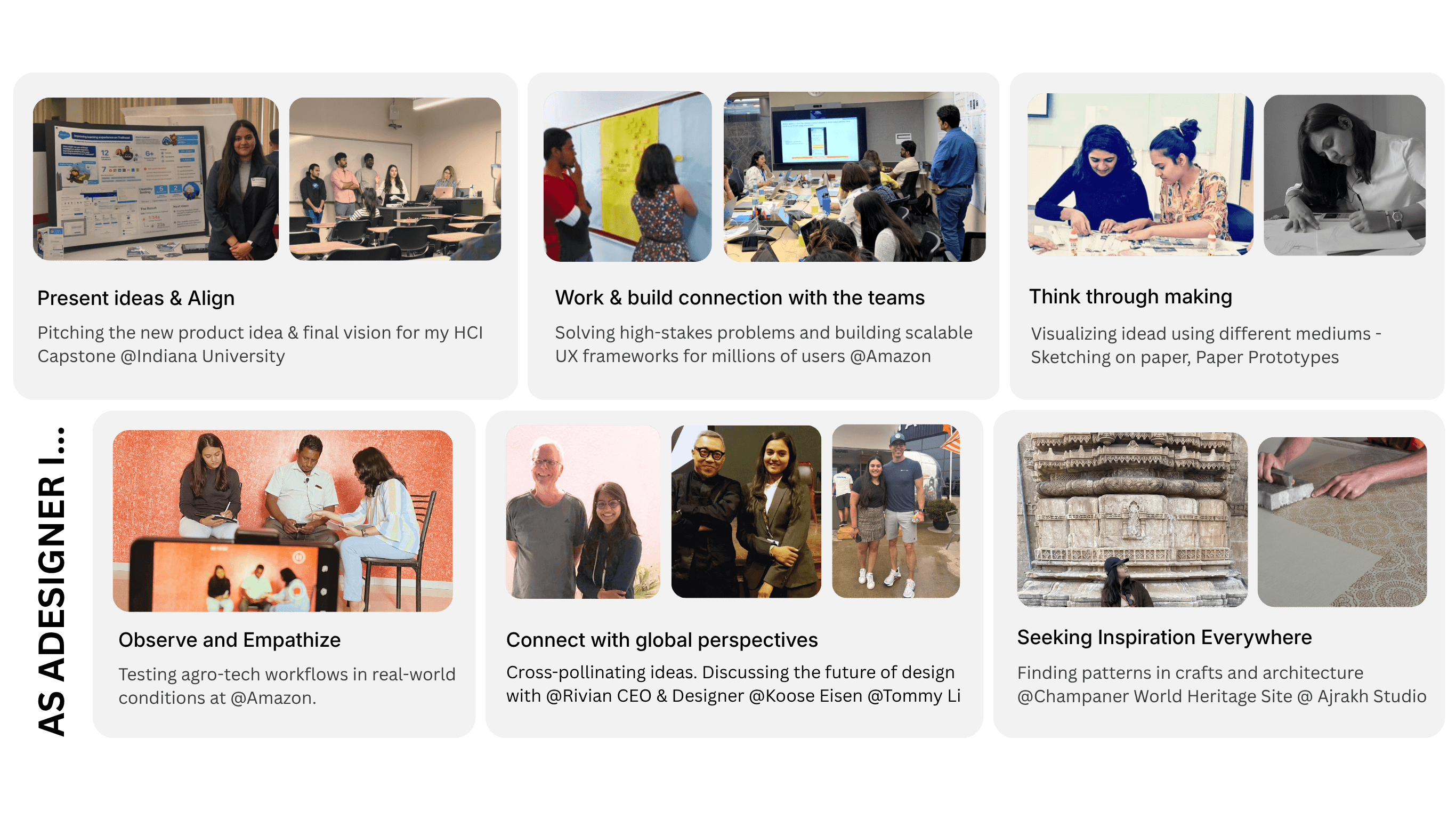 Shipped 15+ consumer-facing and enterpriseproducts across E-commerece, Finance, Logistics, Automotive, and Spatial Tech for brands like Amazon and HDFC Bank. While earning my M.S. in HCI at Indiana University (2024-25), I collaborated with Salesforce Trailhead to design AI-assisted search frameworks for 3M+ global learners.